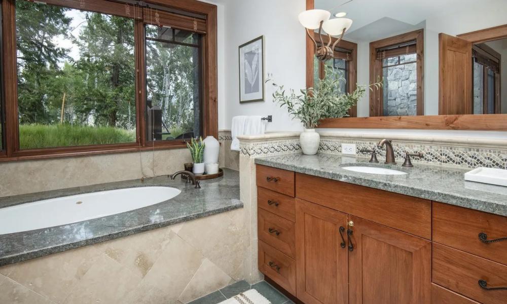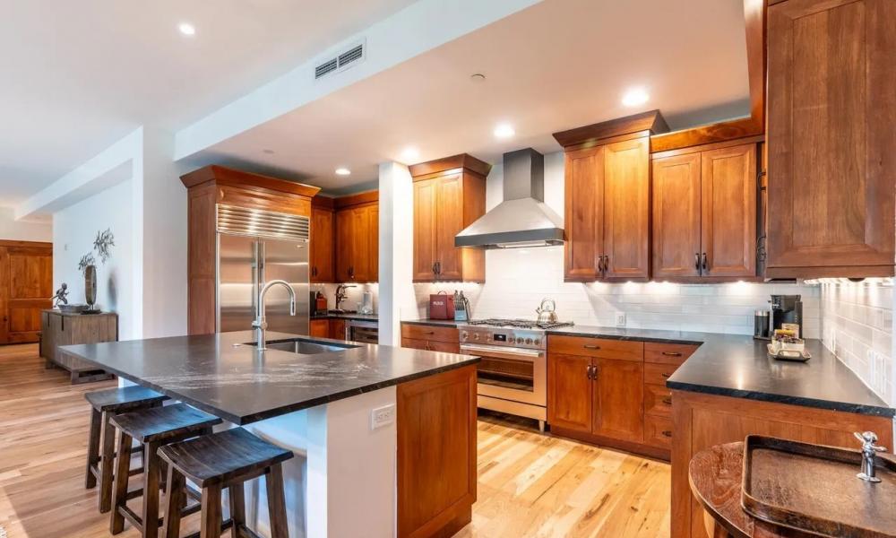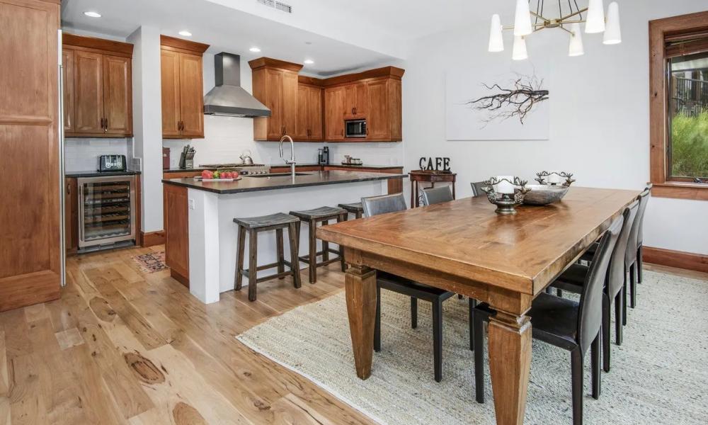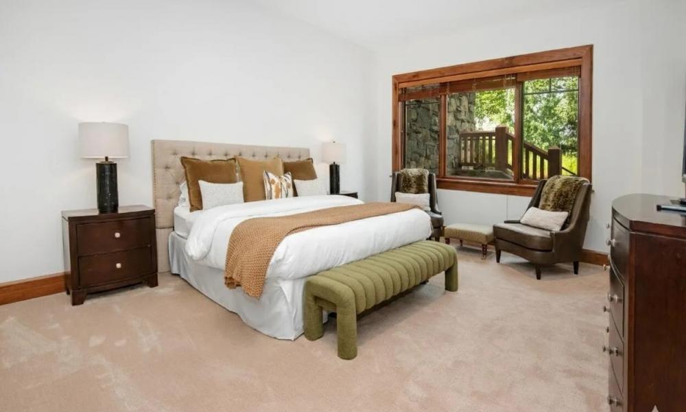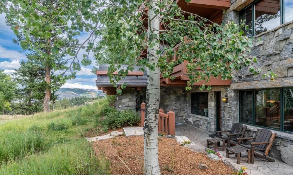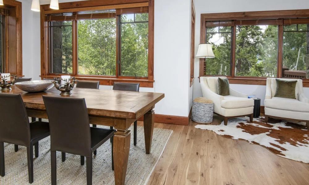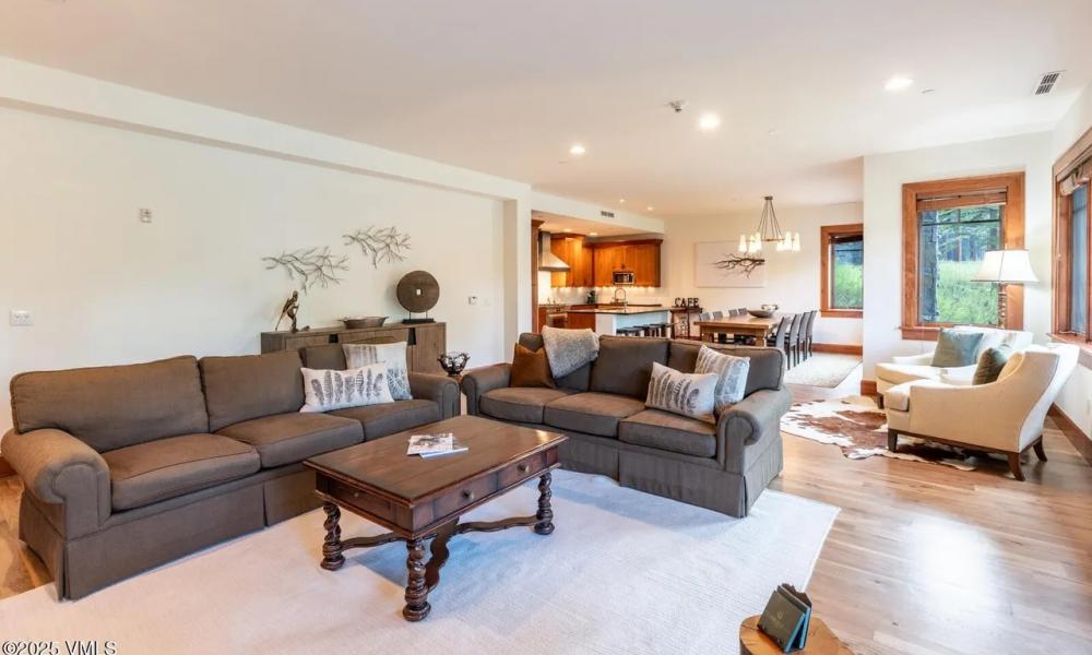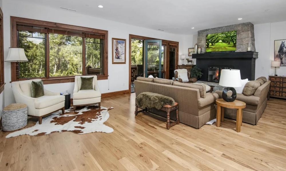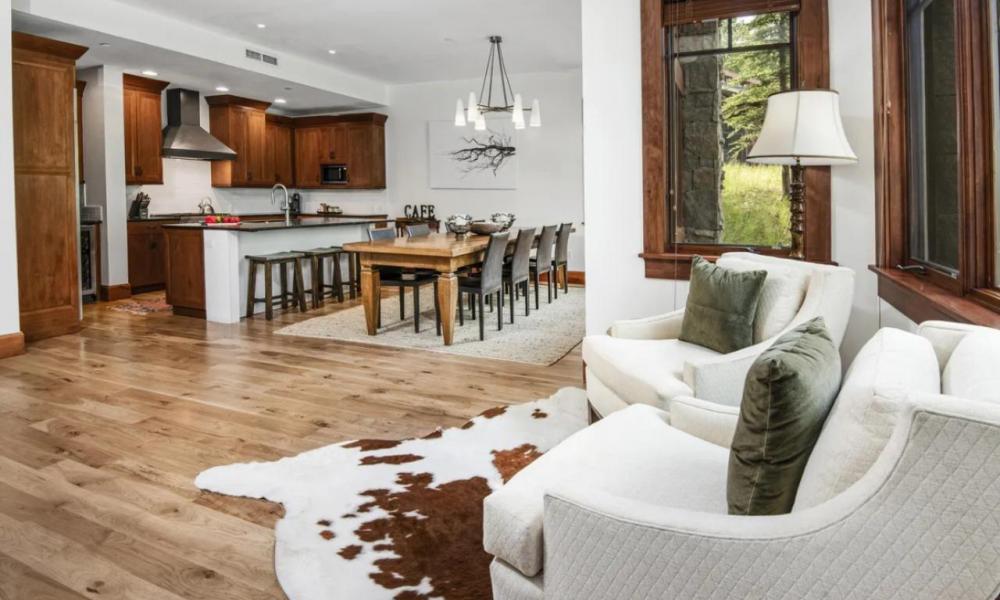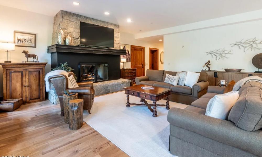 Designed for comfort and style, the home features a dramatic floor-to-ceiling granite fireplace, wide-plank hickory floors, butternut cabinetry, and floor-to-ceiling windows framing breathtaking alpine views. The gourmet kitchen is fully equipped with Viking, Sub-Zero, and Asko appliances and a dual-temperature wine cooler.